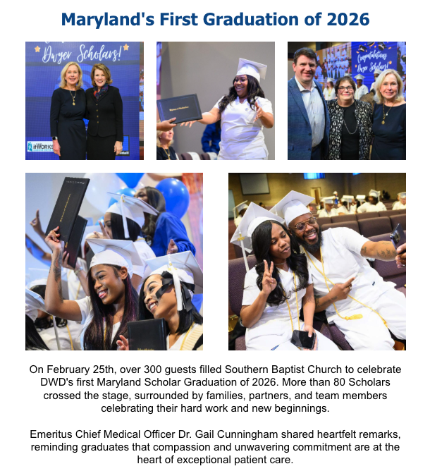 In this month’s newsletter, read about DWD being named to the 2026 Executive Alliance Honor Roll and Megan Heidler, DWD’s Manager of Program Services, being recognized as a 2026 Emerging Leader by The Baltimore Banner. You’ll also find photos from Maryland’s first graduation of 2026. Take a sneak peek below, then click the link to read the full newsletter.
